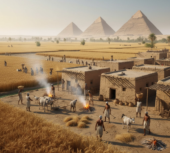 這與我們在教科書中了解到的古王國形象截然不同。當時的景像是零星散落著用曬乾的磚塊砌成的單層房屋,烤麵包的炊煙緩緩升騰。這裡沒有國王或貴族的蹤跡;小小的聚落散佈在廣闊的農田上。這不過是任何一個農業國家的典型景象。