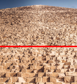 從遠處觀察大金字塔,可以明顯看出,石塊的風化程度在大約14公尺的高度處分界明顯。金字塔的整個龐大結構都在訴說著「水位」的故事。在14公尺以下,石灰岩的邊緣變得圓潤,表面變得多孔,呈蜂窩狀-這種現象稱為「孔隙率」。