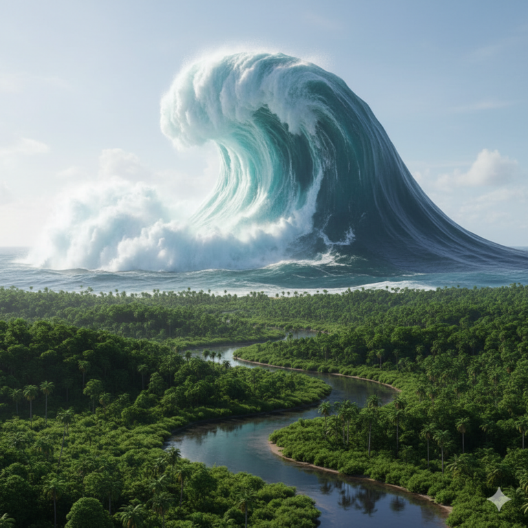 此時,海嘯的位能最終與地形高度相等,其威力也隨之減弱。此時,吉薩已被淹沒在水下100公尺深處。抵達阿斯旺的海嘯能量已然消散,潮水沿著斜坡緩緩退去。從阿斯旺到三角洲,綿延700多公里的森林、岩石和大量沉積物被沖刷殆盡,並迅速向北輸送。