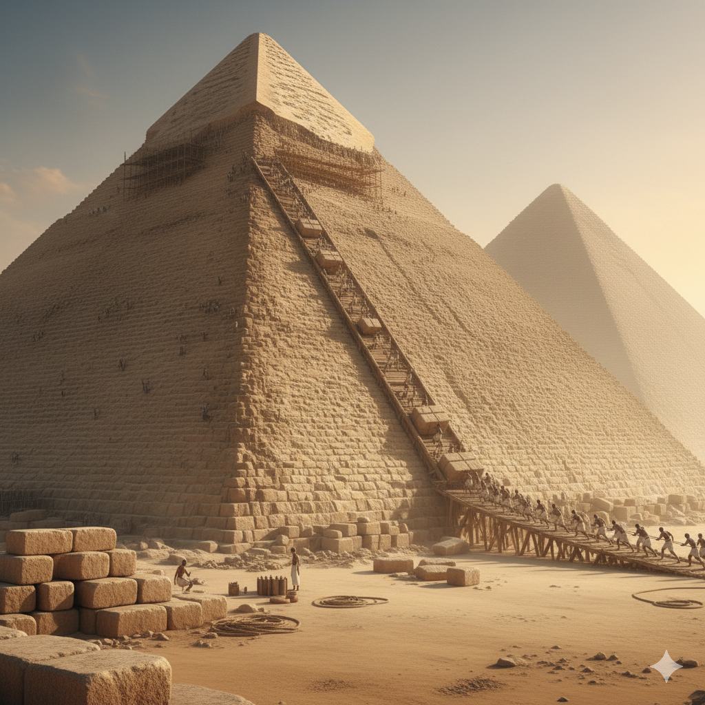 Berücksichtigt man die durchschnittliche Höhe (Schwerpunkt) einer Pyramide und geht davon aus, dass alle 2,3 Millionen Steine auf eine durchschnittliche Höhe von etwa 35 Metern angehoben werden, ergibt sich ein Arbeitsaufwand von unglaublichen 377,2 Millionen Manntagen. Bei einer Arbeitszeit von 12 Stunden pro Tag entspricht das 34.447 Personen täglich. Das ist mehr als das Doppelte der gesamten Belegschaft von Netflix. Alle Köpfe, die den weltweit größten Streaming-Dienst unterstützen, werden als reine Arbeitskraft eingesetzt und kämpfen vor Ort gegen die Schwerkraft. Sie arbeiten ohne Pause oder Urlaub, und erst dann ist das Projekt endlich abgeschlossen.