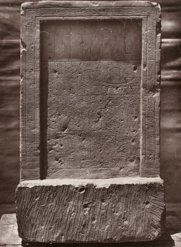 Im Jahr 1858 entdeckte der französische Archäologe Auguste Mariette an der Stätte des Isis-Tempels östlich der Großen Pyramide von Gizeh eine Kalksteininschrift. Dies ist die Kataloginschrift.