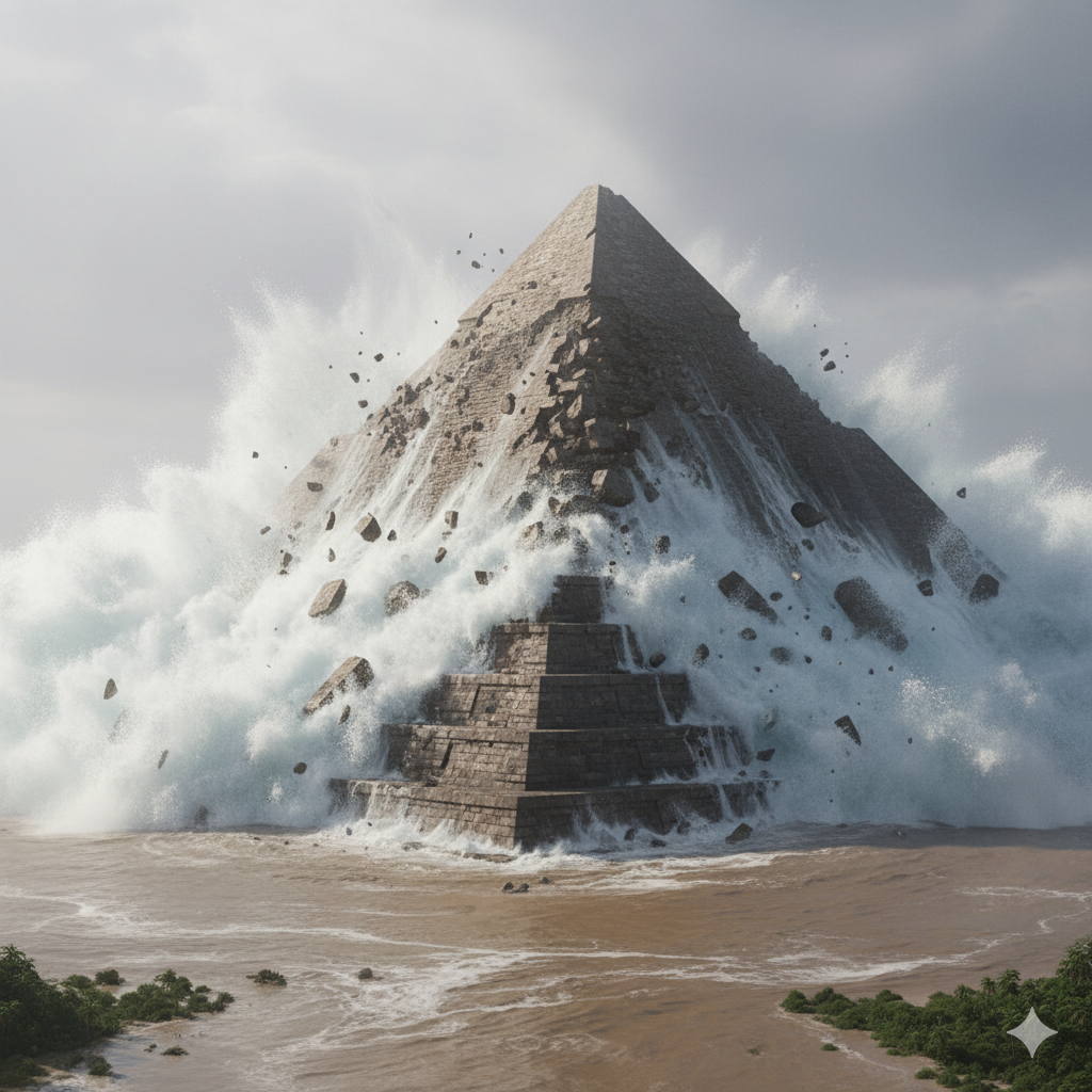 Beton, Eisen und Kunststoff zersetzen sich innerhalb von Jahrtausenden zu Erde. Würde unsere Zivilisation untergehen, würde sie innerhalb von Zehntausenden von Jahren spurlos verschwinden und zukünftigen Generationen keine Grundlage bieten. Gestein hingegen verändert sich selbst nach Zehntausenden von Jahren nicht. Die aus Stein erbauten Pyramiden trotzten Wind, Regen und Tsunamis, die durch Meteoriteneinschläge verursacht wurden. Da sie damals in einer Höhe von 300 Metern über dem Meeresspiegel errichtet wurden, können wir sie glücklicherweise noch heute sehen.