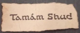 広げられたその紙片には、「Tamam Shud」(タマム・シュッド)という文字が印刷されていた。重要なのは、これが「メモ書き」ではなく、この紙片は、わざわざ文字の周囲を丁寧に切り抜いたものであった。